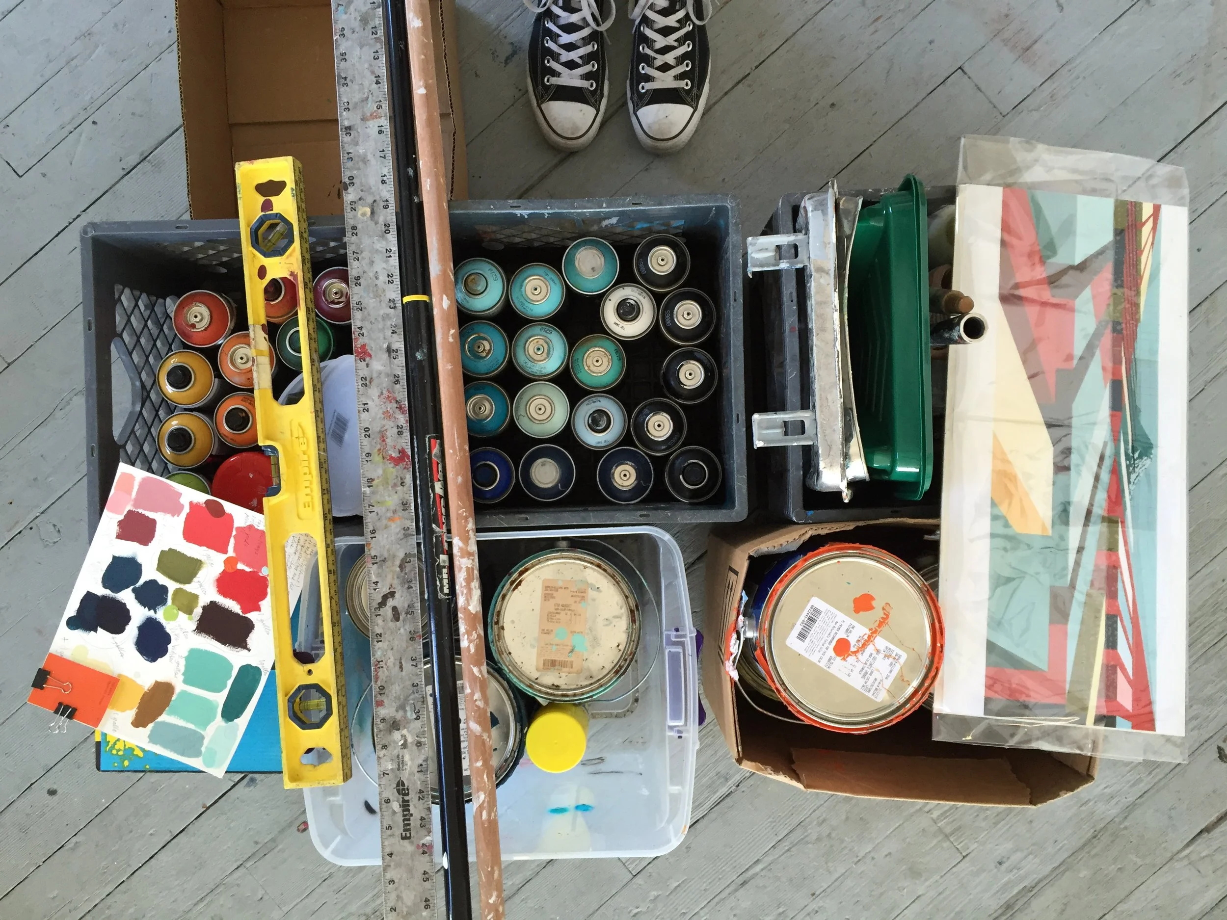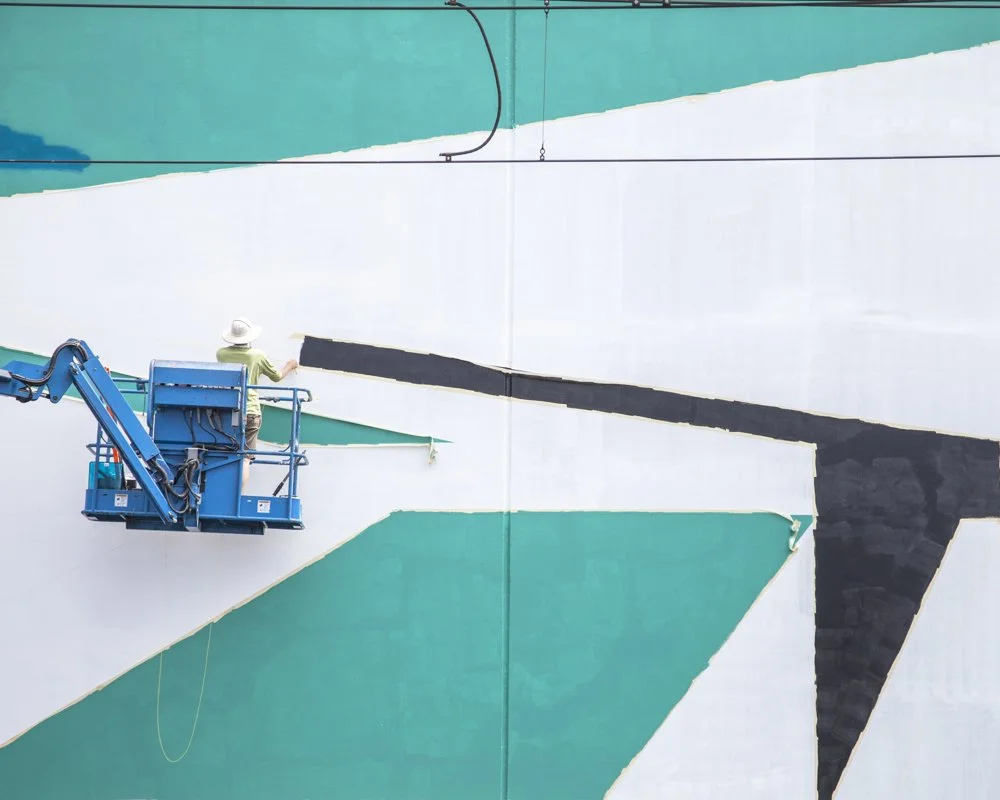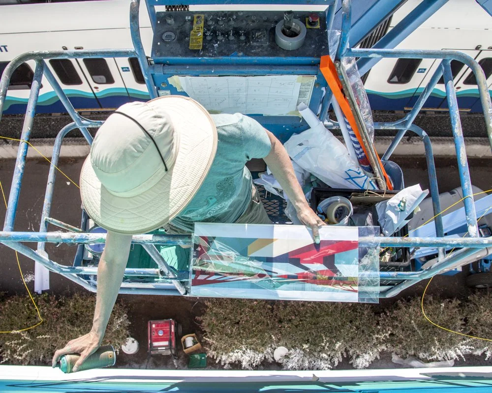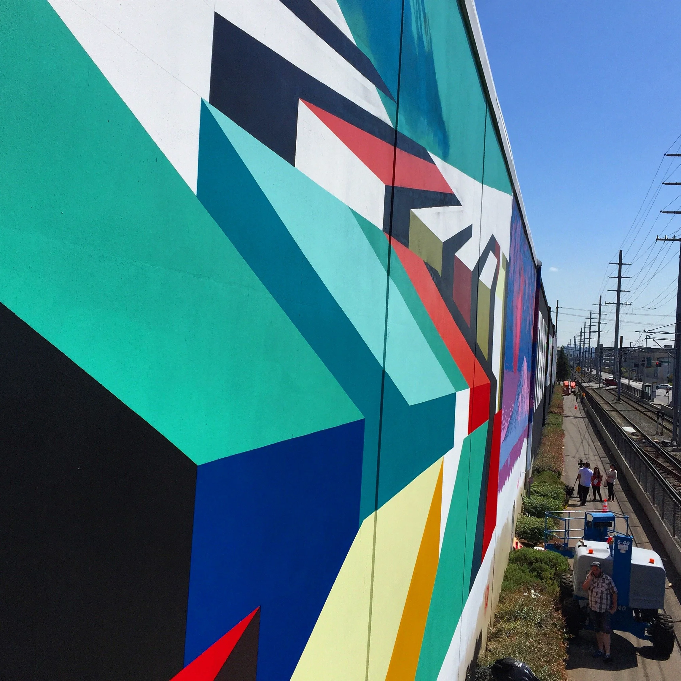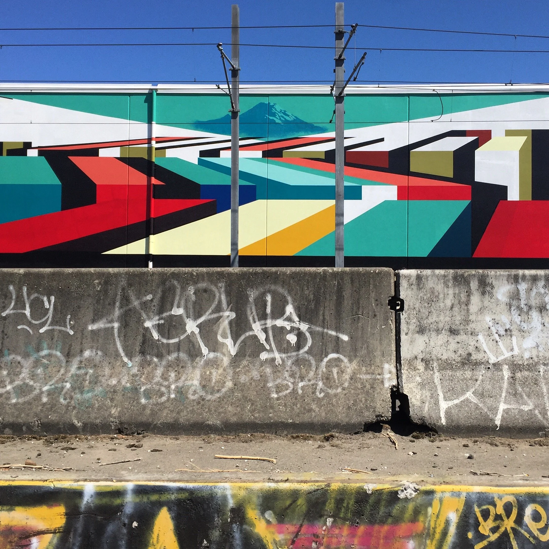 Along the light rail corridor in SODO is a two-mile stretch of murals featuring the work of 60 artists from around the world. While painting my wall, I was honored to be in the company of Cyrcle, Syd Bee, Casey Weldon, Drew Merritt, and Joram Roukes. My design features Mount Rainier floating above a sea of colorful shipping containers in dramatic perspective.