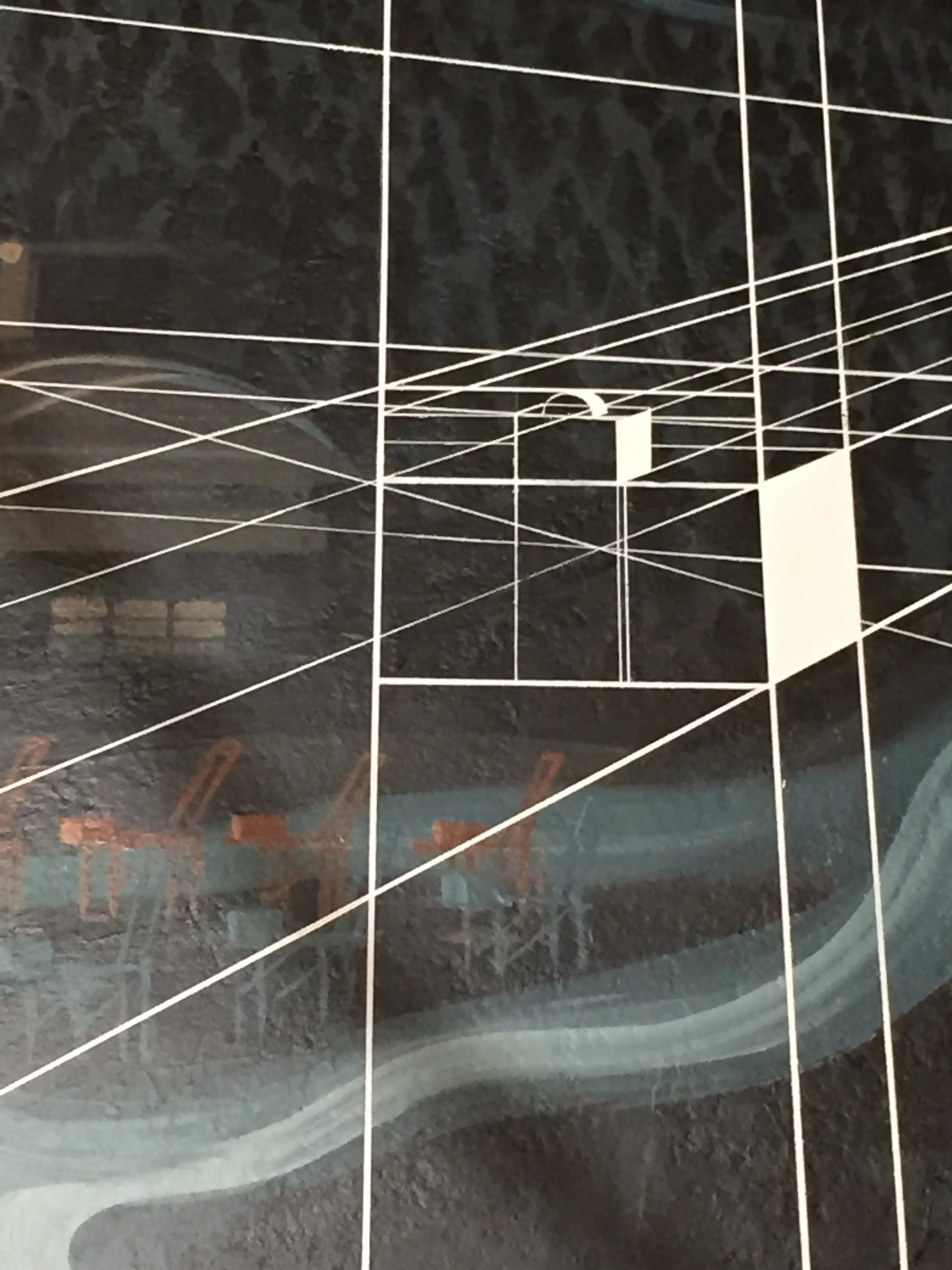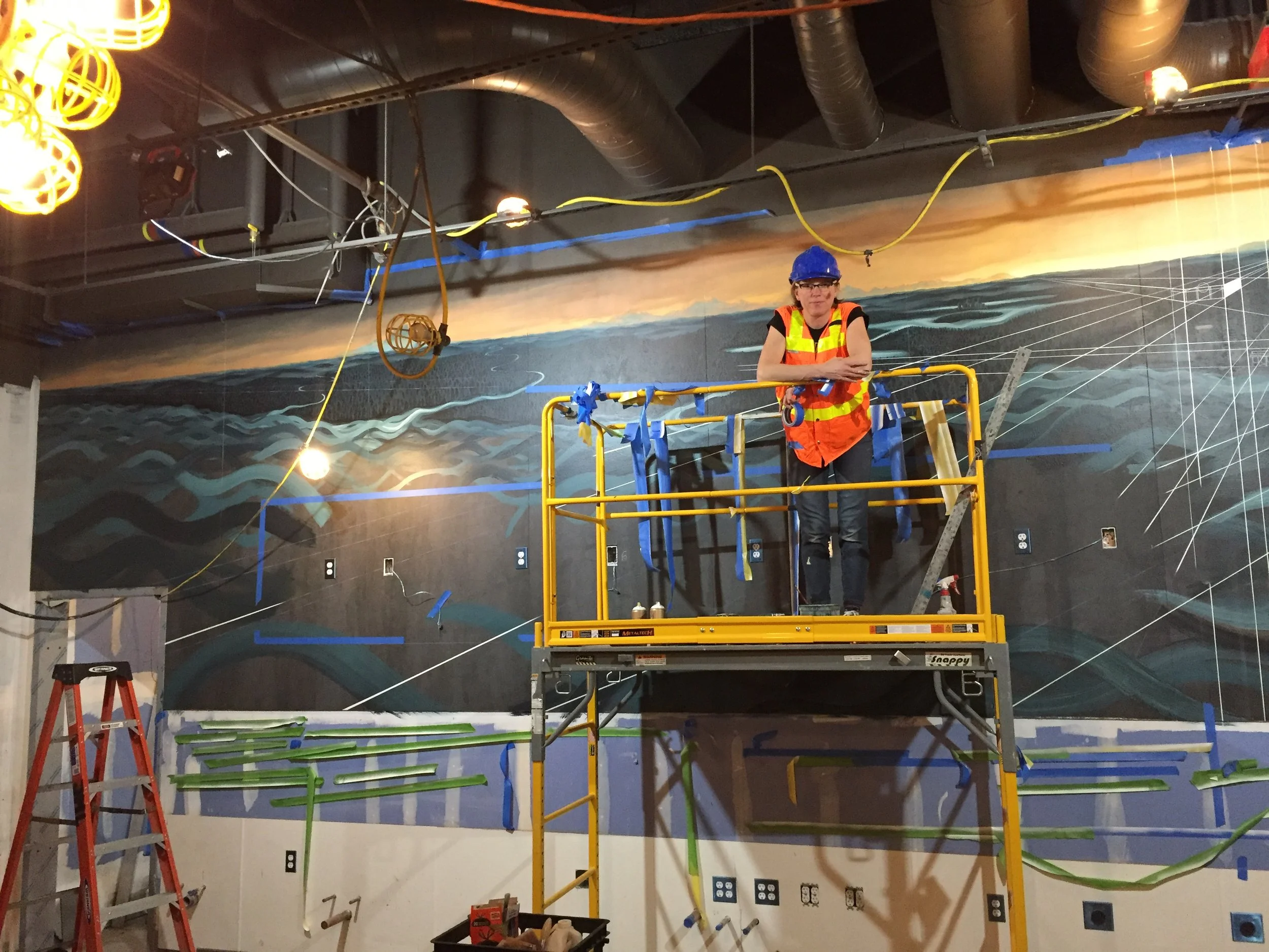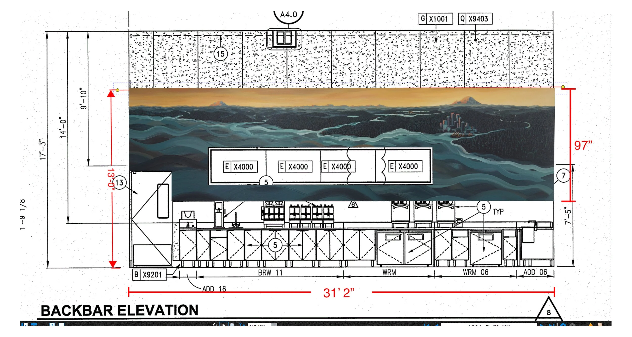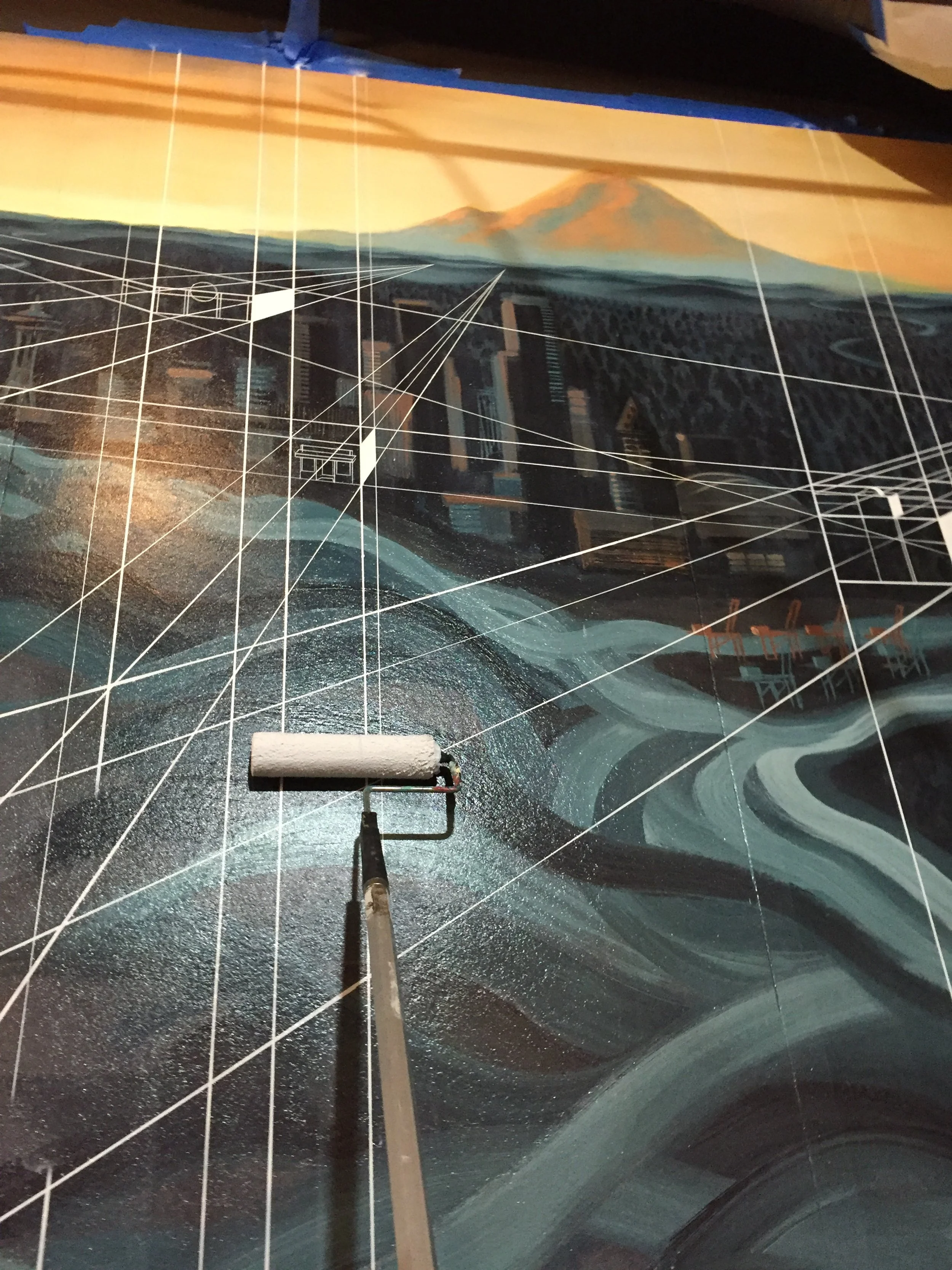 This mural was insprired by the view you see from the airplane window as you are flying into Seattle: mountains all around, water everywhere, and a beautiful city skyline. The grid lines in the design represent a map in perspective, locating the original Starbucks store in Pike Place Market, and the Roastery on Capitol Hill. It was an honor working with Starbucks because they have a huge international following, and they are also a beloved Seattle icon. I actually drink Starbucks coffee every morning, using the pour over technique with their Verona blend.